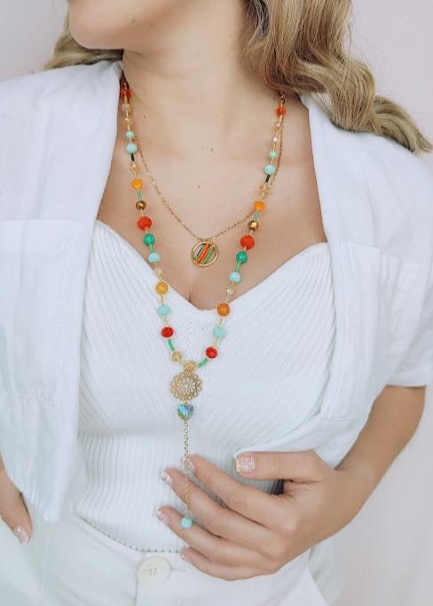 Elaborado en cadena acero con aro decorado en técnica alambrismo con chaquiras y canutillos checos.